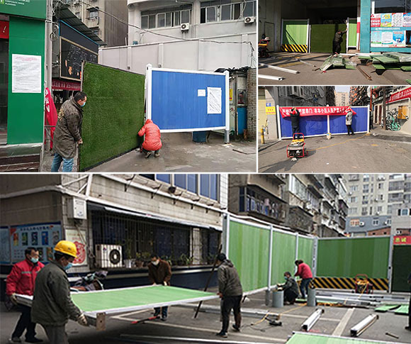 2月1日,在市政實力工程處二期供暖施工現(xiàn)場,經(jīng)理周毅峰為大家準(zhǔn)備好了口罩、消毒水等防控物資,并同大家一起安裝PVC圍檔36米,輔綠植72平方,安裝反光標(biāo)36米。2月4日---2月7日,在樊城立業(yè)路八個“重疫情街道”,大家冒著有可能被感染的危險,在做好自身防護的前提下,安裝了大門8扇、PVC圍檔24米。2月14日,在寒潮來臨之際,上級領(lǐng)導(dǎo)要求把川惠大酒店鋪設(shè)成臨時收置疑似病人場所,一天的時間要安裝大門4扇,PVC圍檔114米,綠植228平方,反光標(biāo)114米,時間短,任務(wù)重,天空還下著雪花,但交安公司的全體員工發(fā)揚吃苦耐勞的精神,克服困難,保質(zhì)保量的完成了上級交給的任務(wù)。回家時,已是凌晨二點。2月15日,在滕天閣施工現(xiàn)場,因雨雪熔化,造成圍檔基礎(chǔ)下沉,存在安全隱患。雖然張建毅和袁超只睡了幾個小時,依然義無返顧去施工現(xiàn)場,整理修復(fù)硬質(zhì)圍檔15米。2月19日,城市交通都被禁止通行的情況下,經(jīng)理周毅峰請派出所的執(zhí)法車輛裝材料,去立業(yè)路金茂小區(qū)及米公所安裝大門2扇,PVC圍檔42米、反光標(biāo)42米。