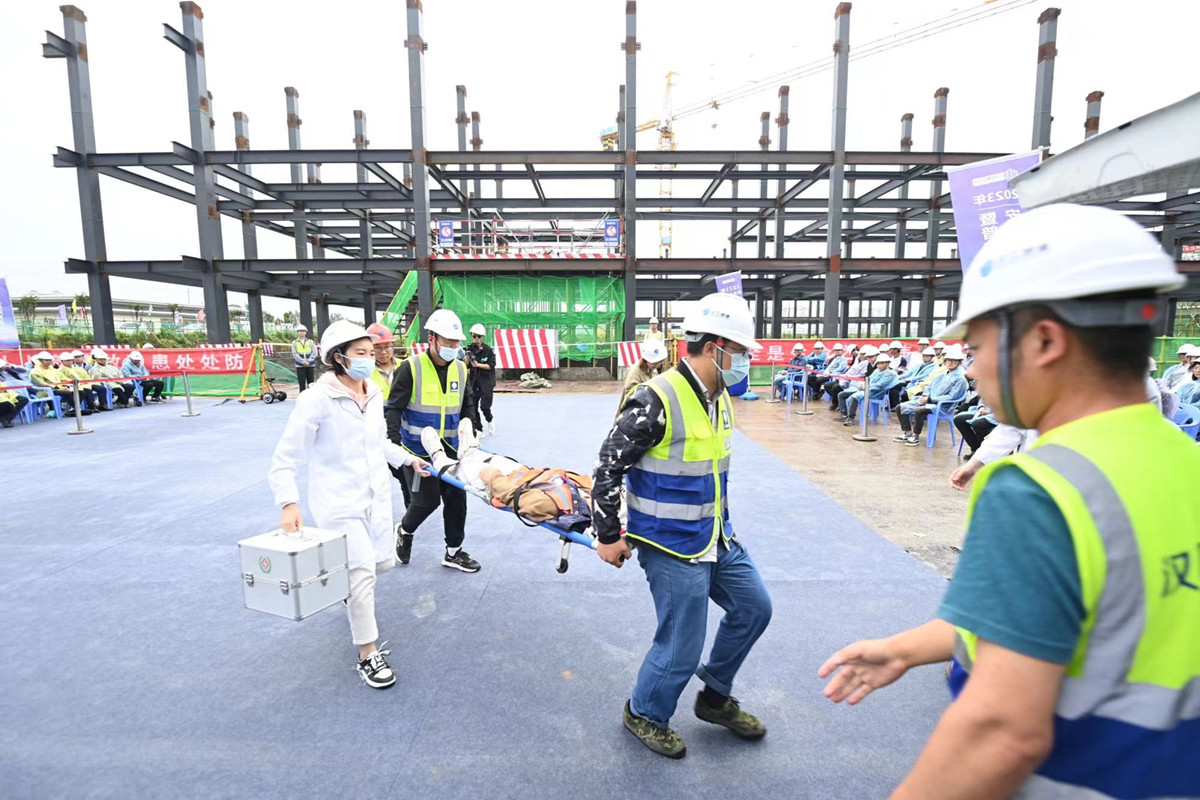 活動伊始,項目負責人進行安全工作匯報,并做了表態(tài)發(fā)言;接著,安全工作負責人帶領現場百余名干部職工,進行莊嚴的集體宣誓;活動中,應急演練小組模擬了高空拋物導致人員遭受物體打擊事故,真實模擬突發(fā)事件處理全過程,加深了全員對“三違”行為危害性的認識,掌握了現場急救知識,提高了應急處理能力。隨后,漢江城建法律顧問何群濤律師開展了《安全生產法》普法宣傳,對項目管理人員進行安全生產專項法律培訓,并通過放置展板、LED屏投放、發(fā)放宣傳冊等方式開展普法宣貫工作。