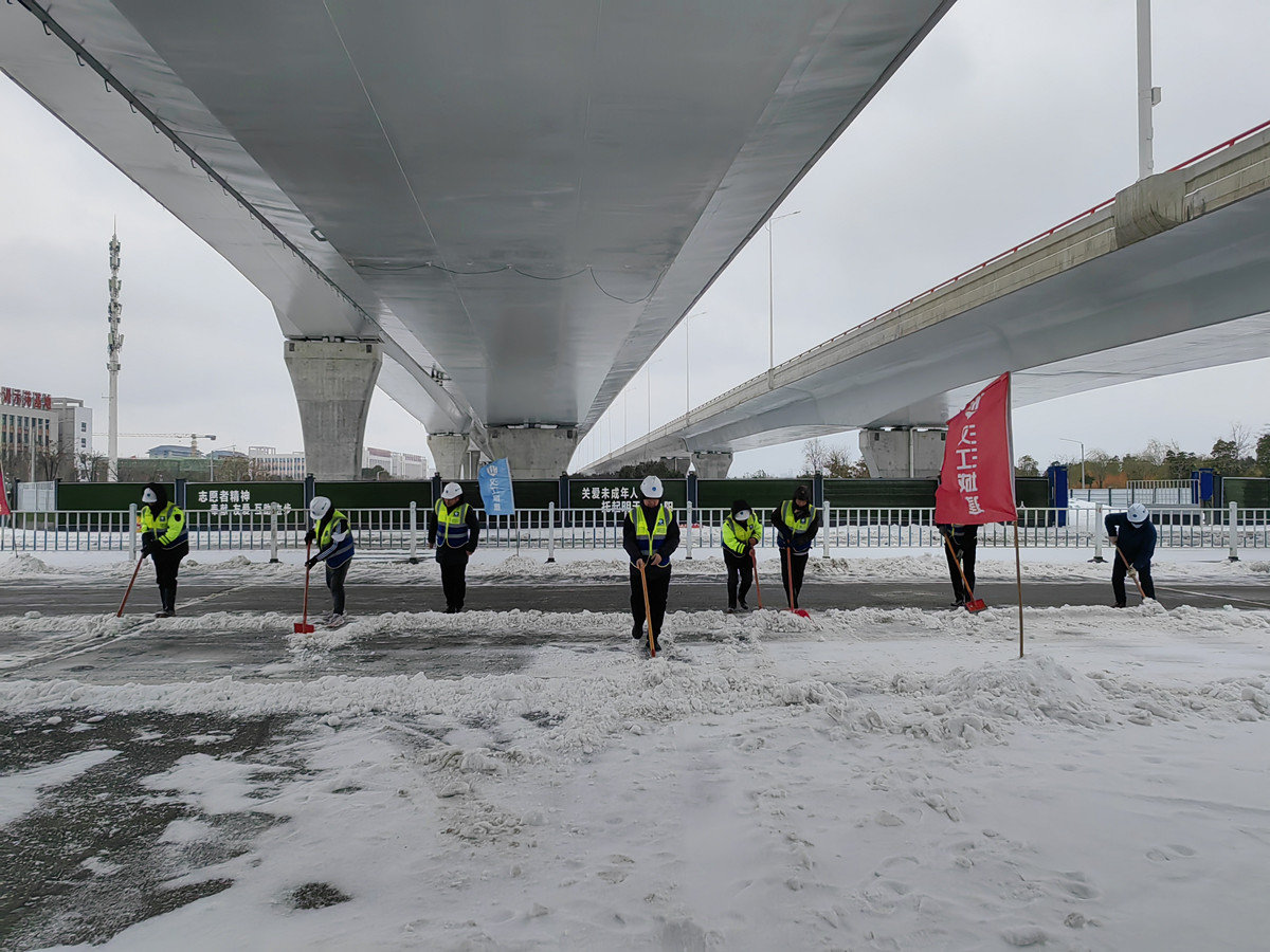 兩個項(xiàng)目負(fù)責(zé)人共計(jì)帶領(lǐng)18名管理人員、鏟車1輛、19把鐵鍬、工業(yè)鹽分別對項(xiàng)目部、東津新區(qū)高鐵南路路段、高鐵南路與現(xiàn)代大道交叉路口等主要干道進(jìn)行除雪搶險工作。大家紛紛拿起鏟子、鐵鍬等工具,分工明確、團(tuán)結(jié)協(xié)作,不畏嚴(yán)寒與清雪設(shè)備并肩作戰(zhàn)將路面上的結(jié)冰鏟除。雖然室外溫度很低,但大家勞動的熱情和團(tuán)結(jié)的力量讓這個冬日變得格外溫暖。