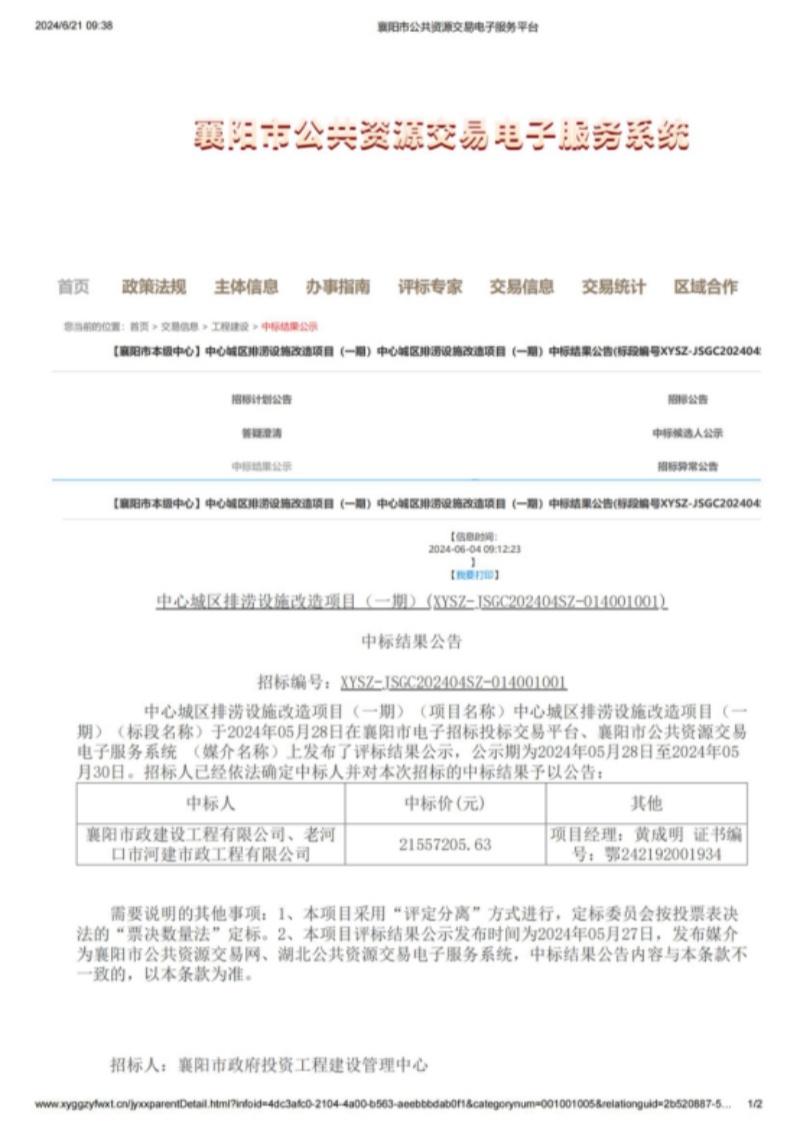 2024年6月4日,襄陽市政建設(shè)工程有限公司成功中標(biāo)中心城區(qū)排澇設(shè)施改造項(xiàng)目(一期),中標(biāo)金額2155.720563萬元,合同工期200日歷天。