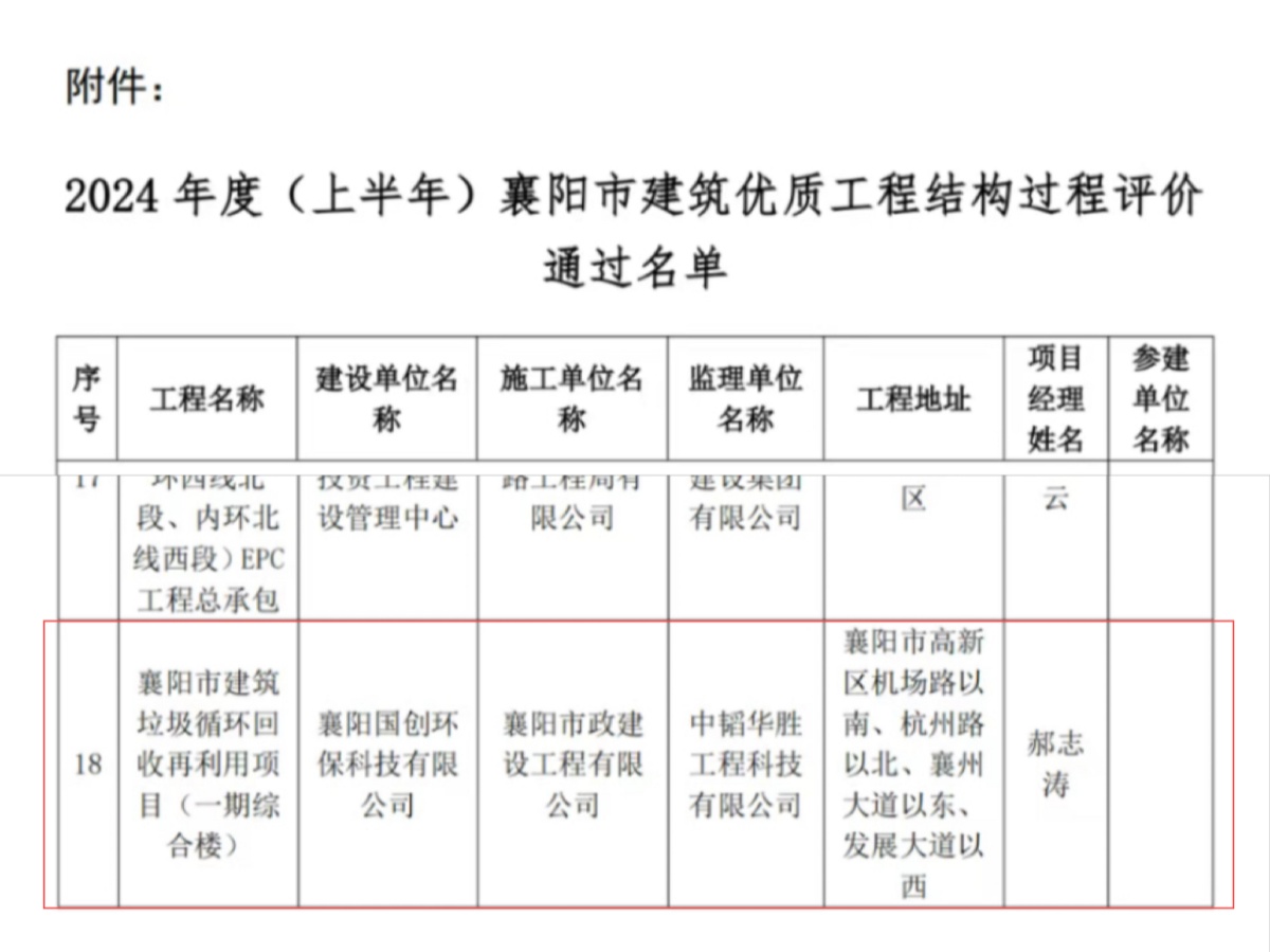 近日,襄陽市建筑業(yè)協(xié)會發(fā)布《關于表彰2024年度(上半年)襄陽市建筑優(yōu)質工程結構過程評價結果的通報》,襄陽市政建設工程有限公司中標承建的襄陽市建筑垃圾循環(huán)回收再利用項目(一期綜合樓)順利通過2024年度(上半年)襄陽市建筑優(yōu)質工程結構過程評價。