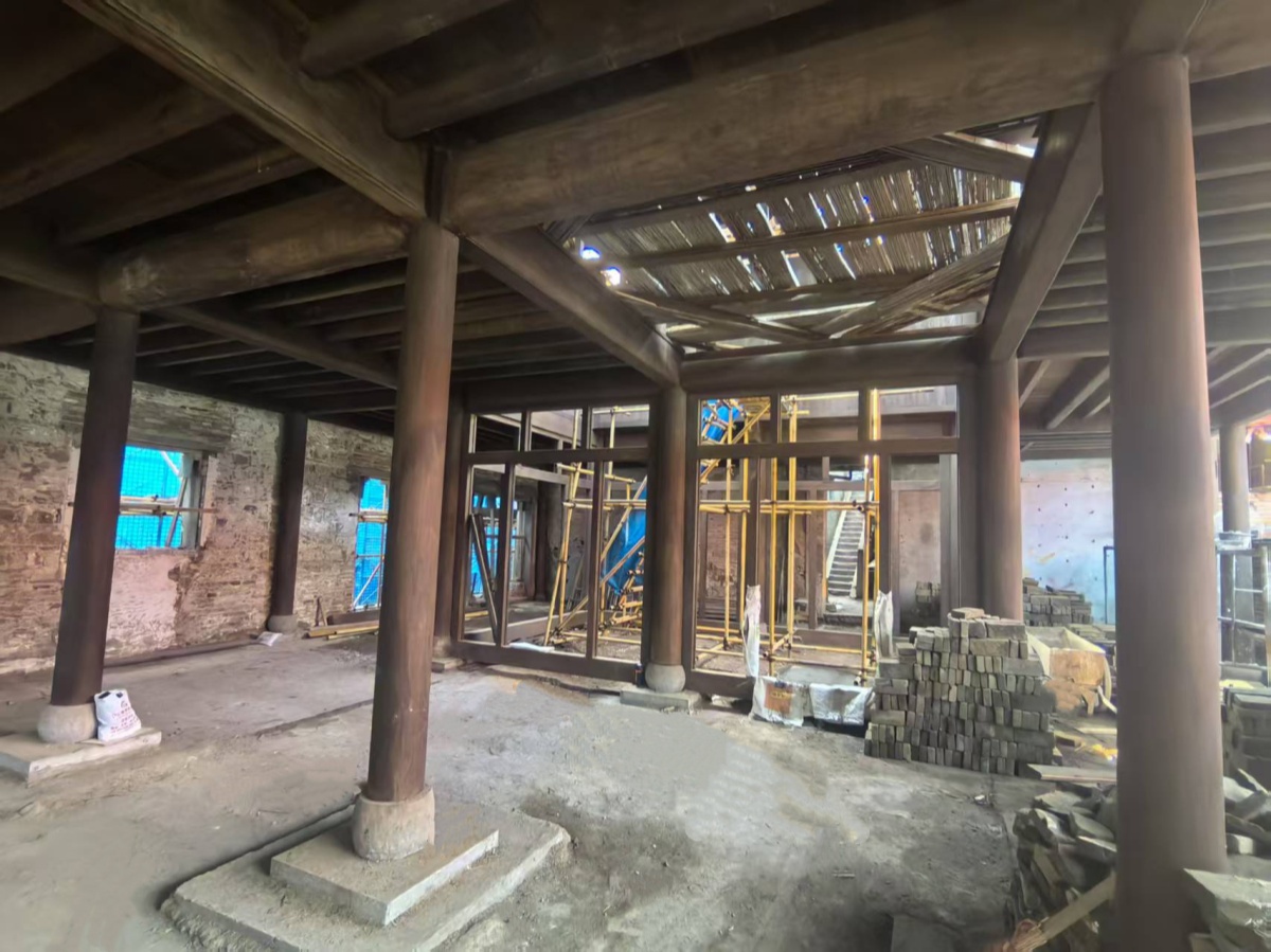 項(xiàng)目部秉持“修舊如故”原則,組建了一支由30余位資深古建筑匠人組成的專業(yè)團(tuán)隊(duì),在施工過程中嚴(yán)格執(zhí)行傳統(tǒng)工藝標(biāo)準(zhǔn),采用傳統(tǒng)榫卯結(jié)構(gòu)拼裝工藝,運(yùn)用木材數(shù)字編碼實(shí)現(xiàn)精準(zhǔn)裝配,僅歷時(shí)七日,便完成了整棟建筑木結(jié)構(gòu)主體的搭建施工。當(dāng)前,屋面系統(tǒng)完成望板鋪裝與防水體系構(gòu)建,室內(nèi)木作工程全面告竣,已完成總體進(jìn)度的70%,下階段將重點(diǎn)推進(jìn)清水磚墻修復(fù)、傳統(tǒng)小青瓦屋面鋪設(shè)及門窗構(gòu)件復(fù)原工作。