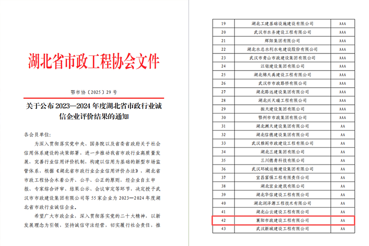 12月29日,湖北省市政工程協(xié)會發(fā)布《關(guān)于公布2023—2024年度湖北省市政行業(yè)誠信企業(yè)評價結(jié)果的通知》(鄂市協(xié)〔2025〕29號),漢江城建子公司市政公司憑借規(guī)范的經(jīng)營管理、扎實(shí)的履約能力和良好的社會責(zé)任口碑,獲評“湖北省市政行業(yè)AA級誠信企業(yè)”。