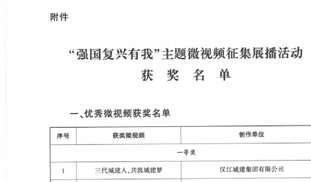 喜報!漢江城建榮獲“強國復(fù)興有我”主題微視頻征集展播活動一等獎