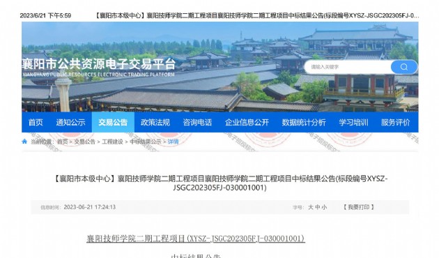 6月21日,漢江城建集團(tuán)有限公司牽頭中標(biāo)襄陽技師學(xué)院二期工程項(xiàng)目(以下稱“本項(xiàng)目”),中標(biāo)金額62825.81萬元,建設(shè)工