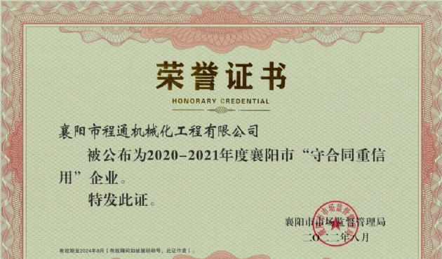 近日,襄陽(yáng)市市場(chǎng)監(jiān)督管理局正式公布了2020—2021年襄陽(yáng)市守合同重信用企業(yè)名單,程通機(jī)械化工程有限公司秉承依法經(jīng)營(yíng)、誠(chéng)信