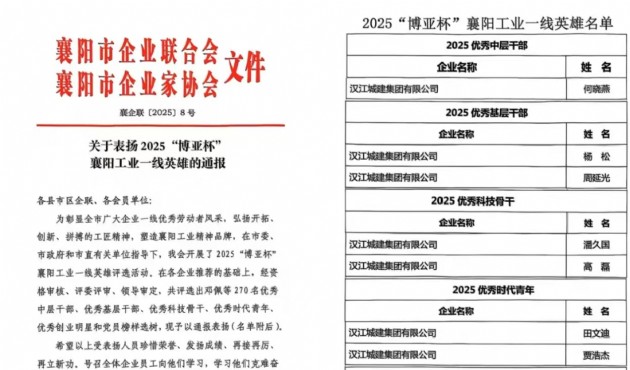 喜報(bào)!漢江城建集團(tuán)多名干部職工 榮獲2025"博亞杯"襄陽工業(yè)一線英雄稱號
