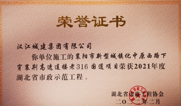 近日,2021年湖北省市政示范工程評選結果公布,由漢江城建承建的襄陽市勝利街景觀大道工程和襄陽市新型城鎮(zhèn)化中原西路下穿襄荊高