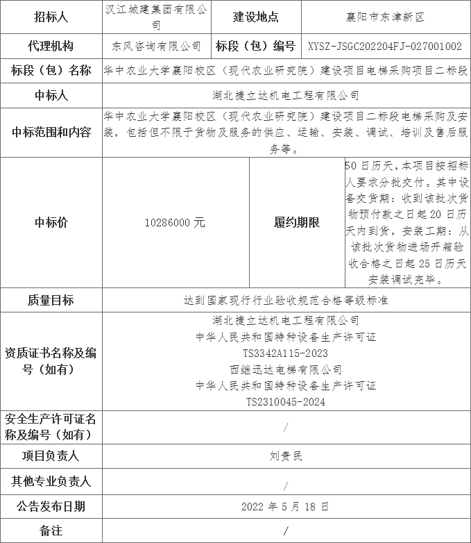 華中農(nóng)業(yè)大學(xué)襄陽校區(qū)(現(xiàn)代農(nóng)業(yè)研究院)建設(shè)項目電梯采購項目二標(biāo)段于2022年5月 10日在襄陽市公共資源交易網(wǎng)、湖北省公共資源交易電子服務(wù)平臺、漢江城建集團有限公司官網(wǎng)發(fā)布中標(biāo)候選人公示,公示期為2022年5月10日至2022年5月12日(北京時間)。公示期間無異議、投訴,F(xiàn)對本次招標(biāo)的中標(biāo)結(jié)果公示如下:
