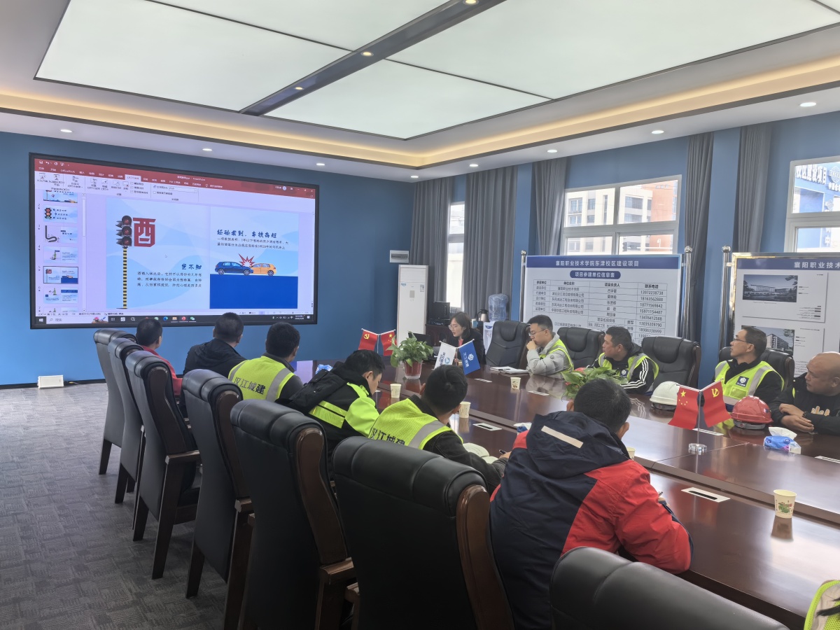 圖為漢江城建紀(jì)委對(duì)襄陽(yáng)職業(yè)技術(shù)學(xué)院東津校區(qū)、襄陽(yáng)技師學(xué)院二期工程項(xiàng)目一線全體管理人員開(kāi)展酒醉駕專題警示教育