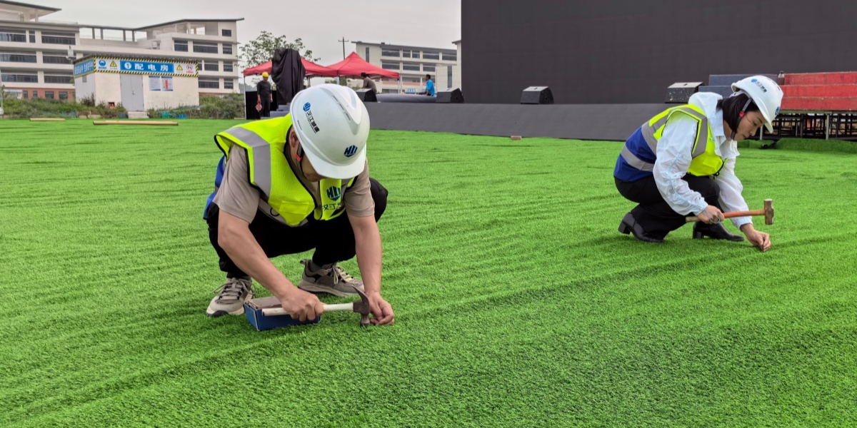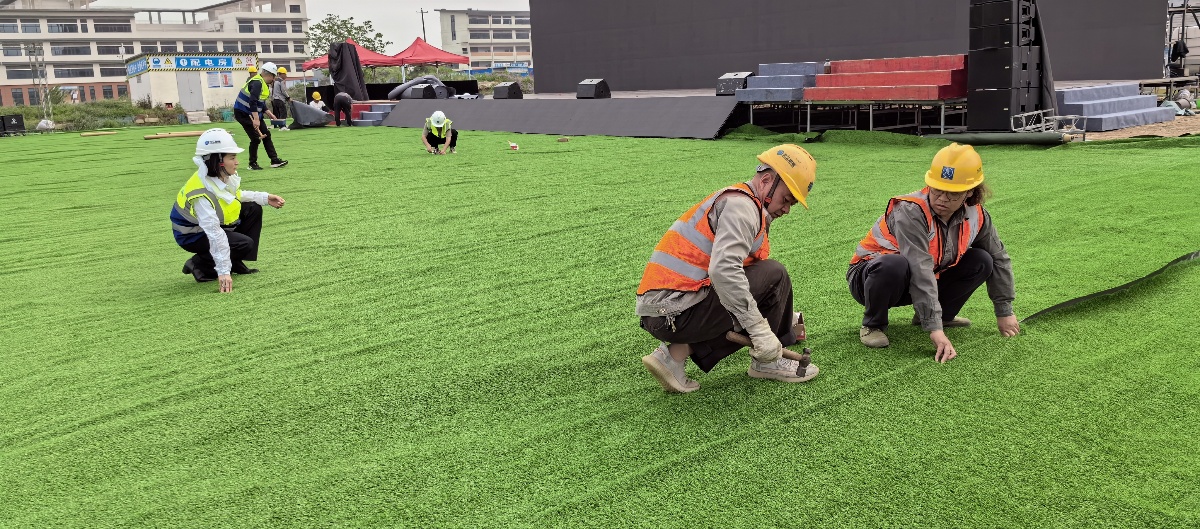 籌備小組在接到通知的第一時(shí)間,迅速進(jìn)駐場地,制訂工作計(jì)劃,明確專人專班,緊鑼密鼓地開展各項(xiàng)準(zhǔn)備工作。對此次競賽的各種材料、機(jī)具等進(jìn)行專人配送,確保賽前所用物資及時(shí)到位。針對湖北文理學(xué)院遷建項(xiàng)目場地的特殊性,現(xiàn)場還增配了兩間移動公廁,沿途安裝了道路指引旗幟,為參賽人員做好后勤保障服務(wù)。24日,黨支部書記崔海玲帶領(lǐng)班子成員及全體黨員對競賽現(xiàn)場的準(zhǔn)備工作進(jìn)行了再梳理、再檢查、再安排,并帶領(lǐng)全體員工進(jìn)行場地草皮鋪設(shè),通過擺位鋪裝、剪裁、拼接、打釘固定等步驟,打造綠色、統(tǒng)一、美觀的賽事場地。此外,滅火器、救援箱等應(yīng)急保障物資也在24日全部運(yùn)送至競賽現(xiàn)場。