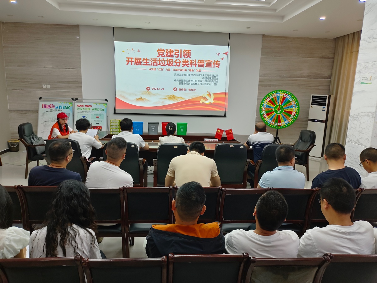 為進一步深化黨建引領(lǐng)綠色發(fā)展理念,充分發(fā)揮黨員在垃圾分類工作中的先鋒模范帶頭作用,倡導(dǎo)共享綠色低碳生活,營造垃圾分類良好氛圍,5月24日,襄陽康宇潔環(huán)境衛(wèi)生管理有限有公司、春園社區(qū)居委會、襄陽市政建設(shè)工程有限公司、襄陽市程通機械化工程有限公司四家單位組織22名黨員及入黨積極分子在程通機械化公司會議室聯(lián)合開展“黨建引領(lǐng)——開展生活垃圾分類科普宣傳”主題活動。