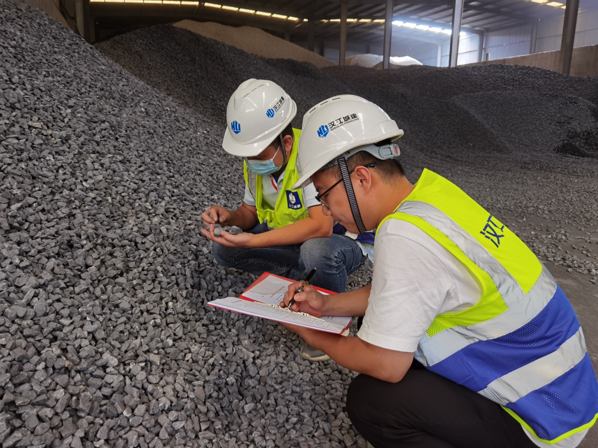 圖為:漢江城建第三分公司對瀝青原材料及石料規(guī)格進行質(zhì)量檢查