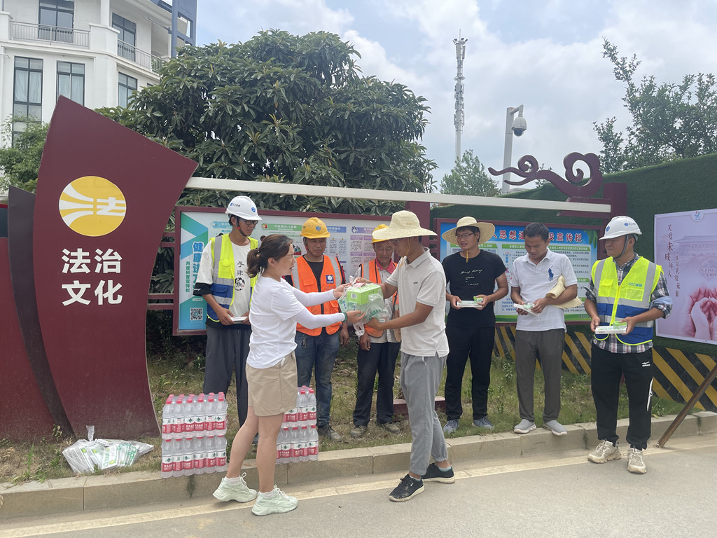 近日持續(xù)高溫天氣,市政工程公司為推進(jìn)“下基層、察民情、解民憂、暖民心”實(shí)踐活動(dòng),保障施工一線人員的安全健康,有效地促進(jìn)安全生產(chǎn)經(jīng)營(yíng),及時(shí)采取高溫天氣應(yīng)對(duì)措施,認(rèn)真做好職工防暑降溫工作。6月18日,經(jīng)理來(lái)向東、支部書(shū)記程健帶領(lǐng)慰問(wèn)組分赴各在建項(xiàng)目現(xiàn)場(chǎng),慰問(wèn)在高溫酷暑下仍?shī)^戰(zhàn)一線的施工人員,并親自為他們送上礦泉水、風(fēng)油精、防暑降溫藥品等物資,把組織對(duì)員工的關(guān)懷送到心坎上,在炎炎夏日中為大家送上一份清涼和暖心,感謝他們?yōu)楣景l(fā)展所做出的奉獻(xiàn)。