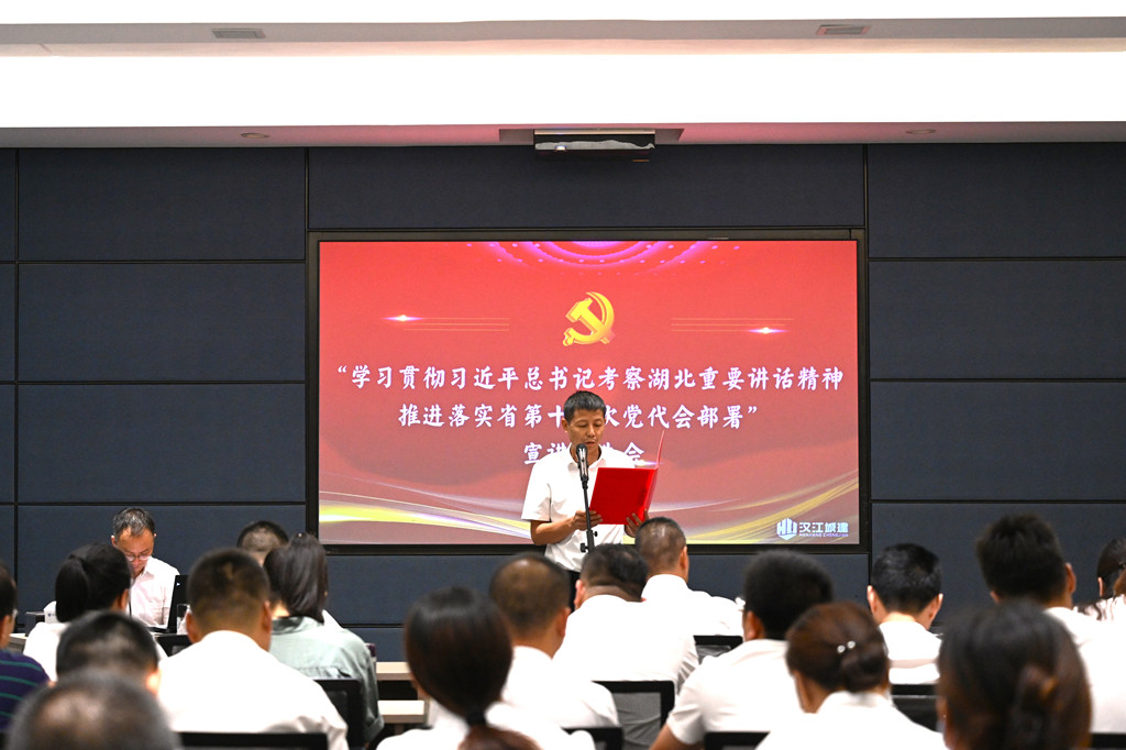 8月11日,漢江城建舉行“學(xué)習(xí)貫徹習(xí)近平總書記考察湖北重要講話精神 推進(jìn)落實(shí)省第十二次黨代會(huì)部署”專題宣講報(bào)告會(huì)。邀請(qǐng)市委宣講團(tuán)成員、湖北文理學(xué)院黨委副書記、副校長、宣傳部長張樊教授作宣講報(bào)告。參加此次會(huì)議的有漢江城建集團(tuán)在家領(lǐng)導(dǎo)、分(子)公司中層正職干部及機(jī)關(guān)全體黨員約50余人。集團(tuán)黨委副書記、董事姚忠主持會(huì)議。